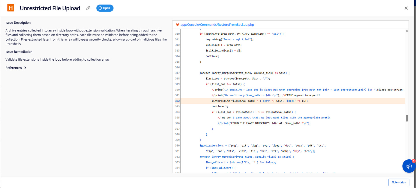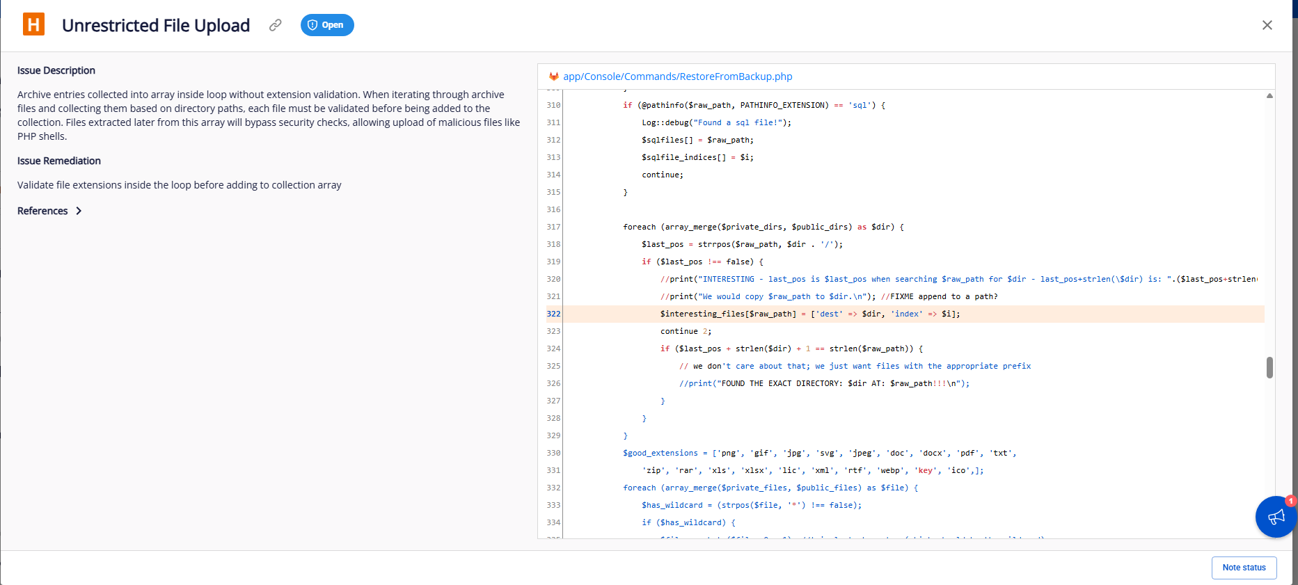 During our analysis of CVE-2025-63601, we relied on ASPM’s code scan engine — its static analysis rules (taint tracing, data-flow tracking,…) combined with AI-assisted pattern recognition made it easy to pinpoint the vulnerable code path.
