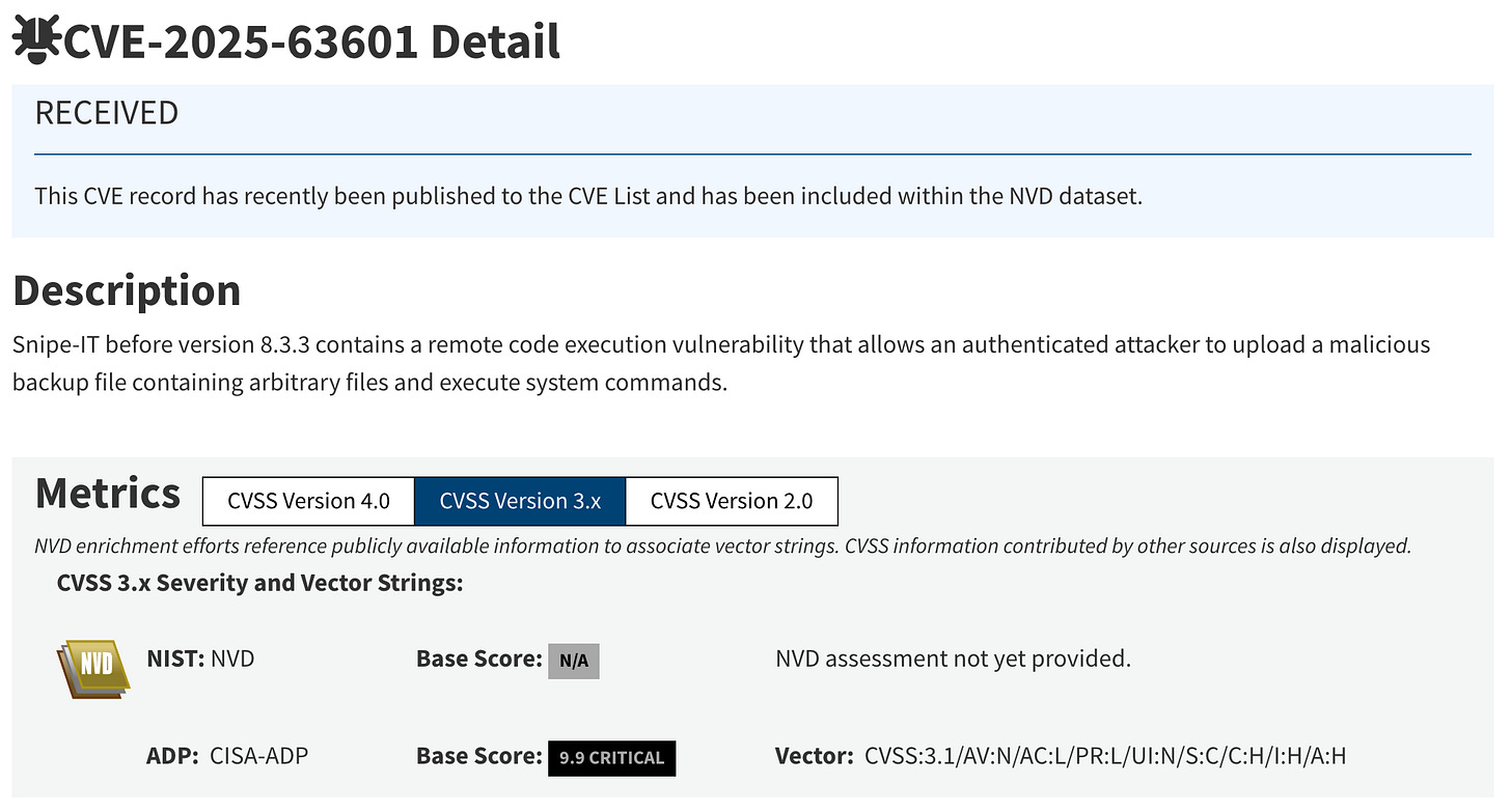 Snipe-IT: CVE-2025-63601 - Post-Authenticated Remote Command Execution via Backup Restore Feature